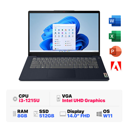 Lenovo IdeaPad 3 14IAU7 82RJ001CVN : i3-1215U | 8GB RAM | 512GB SSD | Intel UHD Graphics | 14 inch FHD | Finger | Windows 11 | Abyss Blue
