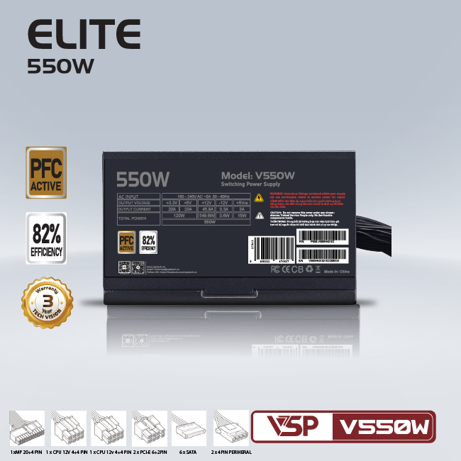Nguồn máy tính VSP Elite Active PFC V550W Chính Hãng
