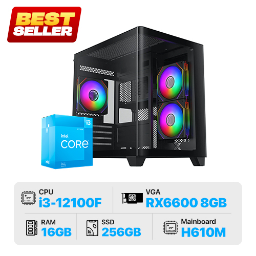 PC Gaming KLC-PANO : i3-12100F TrayNEW | 16GB | 256GB SSD | H610M | RX 6600 8GB | 650W | Case Xigmatek Gaming Pano EN45523