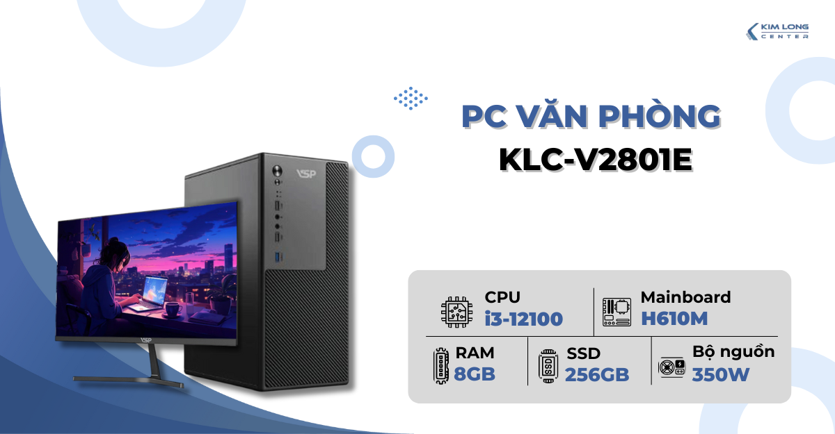 [New 100%] PC Văn Phòng KLC-V2801E i3-12100 | 8GB | 256GB SSD | Main H610M | P350W | CASE V2801 | KM K120 + LCD V2204H
