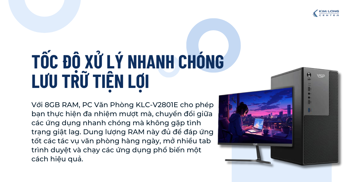 Với 8GB RAM, PC Văn Phòng KLC-V2801E cho phép bạn thực hiện đa nhiệm mượt mà, chuyển đổi giữa các ứng dụng nhanh chóng mà không gặp tình trạng giật lag. Dung lượng RAM này đủ để đáp ứng tốt các tác vụ văn phòng hàng ngày, mở nhiều tab trình duyệt và chạy các ứng dụng phổ biến một cách hiệu quả.