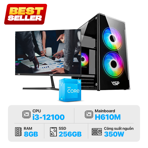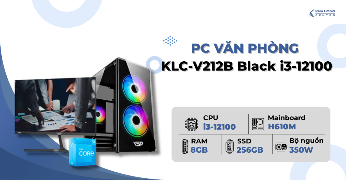[New 100%] PC Văn phòng KLC-V212B Black i3-12100/ 8GB RAM/ 256GB SSD/ H610M/ P350W/ Case V212/ K&M K120 + Màn hình VSP IP2407S